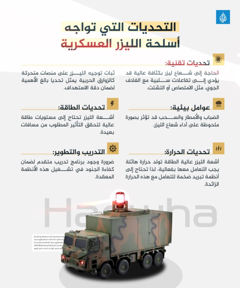 مثلا، السبب في أن تطوير هذه الأسلحة يستغرق مدة زمنية طويلة هو أنه لكي تتمكن من تدمير طائرة مسيّرة تحتاج إلى شعاع ليزر قوي بكثافة عالية للغاية. لكن إن كان شعاع الليزر قويا للغاية، فقد يتفاعل بقوة مع الهواء في الغلاف الجوي، مما يؤدي إلى امتصاصه أو تشتيته. لذا، ينبغي تحقيق التوازن المثالي لمعطيات الشعاع، مثل قدرة طوله الموجي وهيئته، للتأكد من إمكانية انتشاره لمسافات طويلة من دون حدوث تشتت ملحوظ.