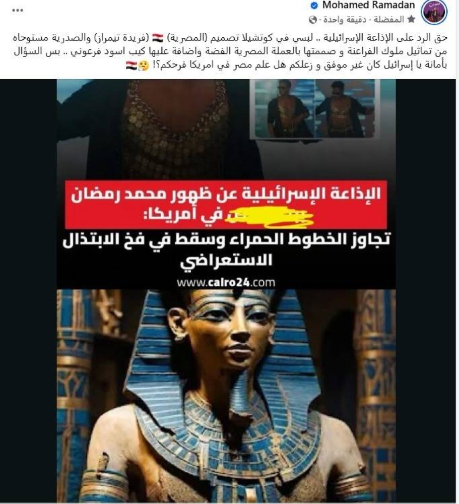 كتب محمد رمضان، منشوراً للرد على الجدل المثار حول إطلالته عبر حسابه الشخصي بموقع التواصل الاجتماعي «فيسبوك»، وقال: «الإطلالة من تصميم عارضة أزياء مصرية تدعى فريدة تيمراز ومستوحاة من تماثيل ملوك الفراعنة وتم تصميمها بالعملة المصرية الفضة مضاف عليها كاب أسود فرعوني».