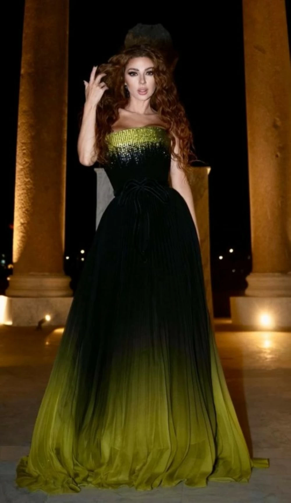 في الإطلالة الأولى، ارتدت ميريام فارس فستانًا أخضر فسفوريًا تميز بلونه الزاهي وتصميمه الذي يبرز شكل الجسم. هذا اللون الحيوي عادة ما يكون له تأثير قوي في المناسبات الاحتفالية، لكنه يحتاج إلى دقة في التصميم وتنفيذ متقن في القماش والتشطيب ليبدو مناسبًا للحدث.