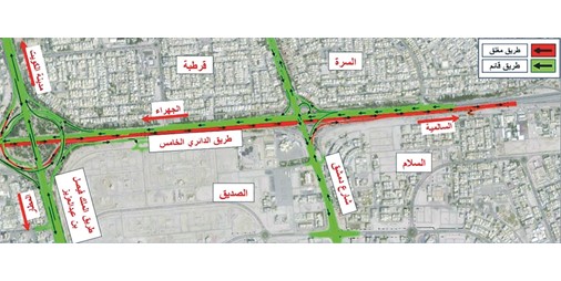 وسيبدأ الإغلاق المؤقت لطريق الدائري الخامس من تقاطع طريق الملك فيصل بن عبدالعزيز (المعروف أيضًا بطريق 50) وحتى تقاطع طريق الملك فهد بن عبدالعزيز (طريق 40). وأوضحت الوزارة أن الإغلاق سيبدأ بعد منتصف الليل في يوم الخميس الموافق 25 من الشهر الجاري، ويستمر حتى الساعة الخامسة صباحًا.