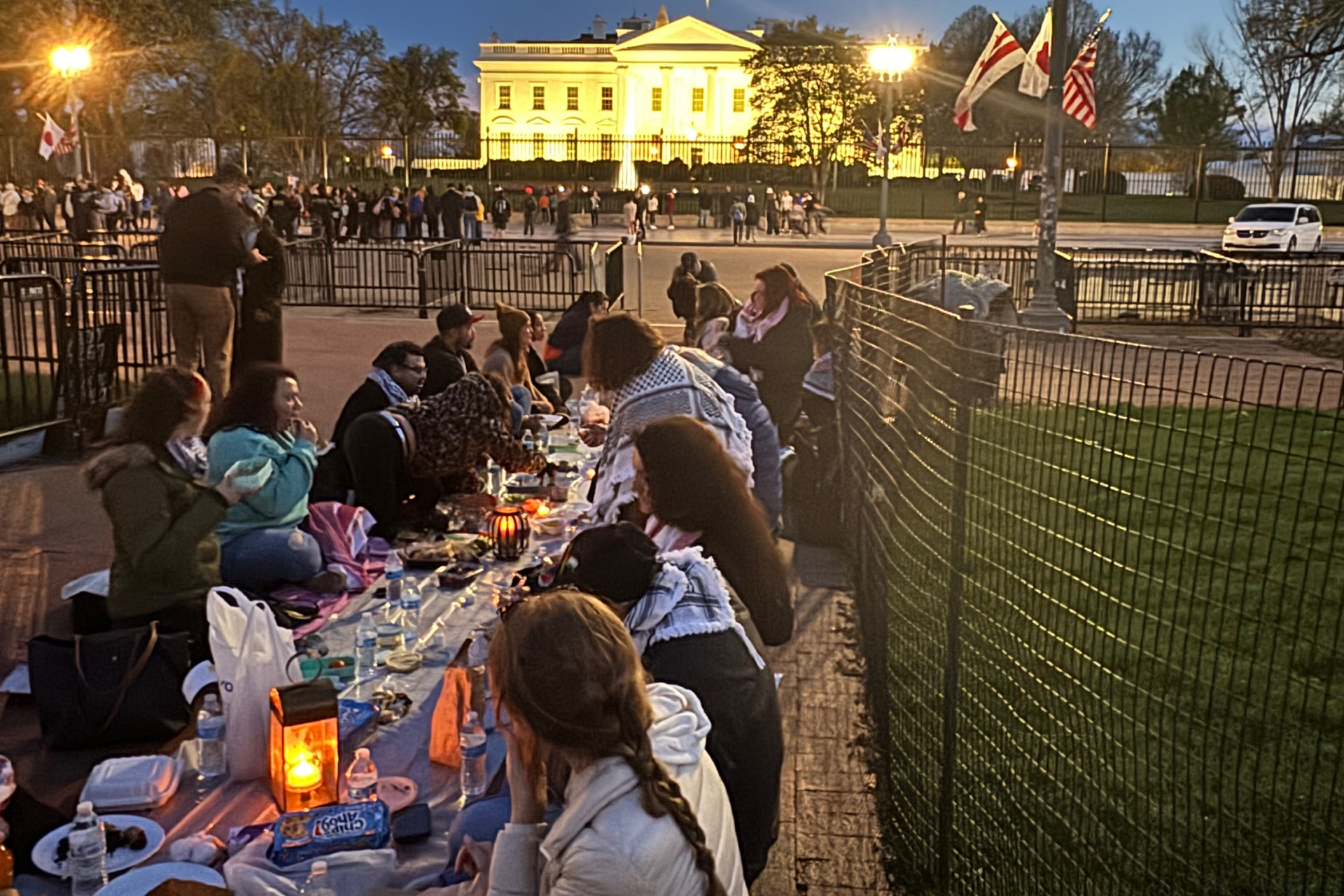 وشغل المحتجون الذين تقودهم الناشطة ذات الأصول السورية الفلسطينية حزامي برمدا، أحد الأرصفة وسط حديقة لفاييت المواجهة للبيت الأبيض، حيث أحضر كل مشارك طعام إفطاره، وتشاركوا جميعا في تناول الطعام، في حين وفر المنظمون المشروبات والتمر.