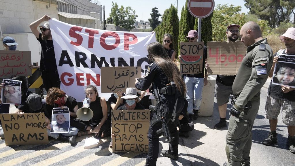 ورفع المتظاهرون لافتات كتب عليها “توقفوا عن تسليح الإبادة”.