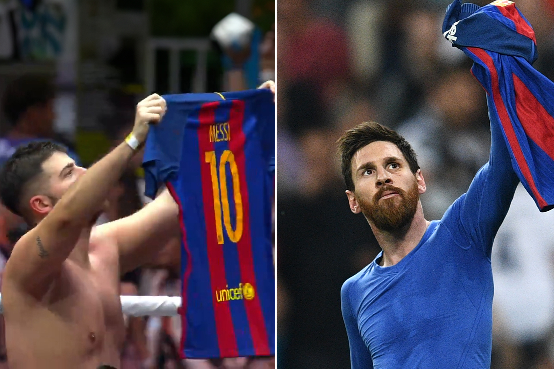 وعند إعلانه بطلا تسلم الملاكم الأرجنتيني قميص ميسي وقام بعرض اسم الأسطورة للجمهور وسط صفارات استهجان كبيرة من جماهير ريال مدريد الإسباني، ليكرر الاحتفال الشهير الذي قام به “البولغا” في إياب كلاسيكو الدوري الإسباني لكرة القدم لموسم 2016-2017.