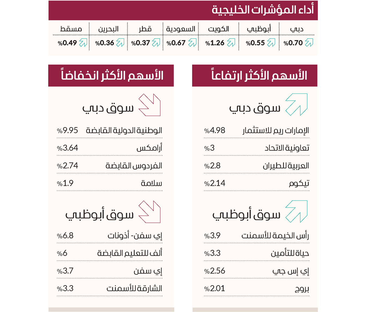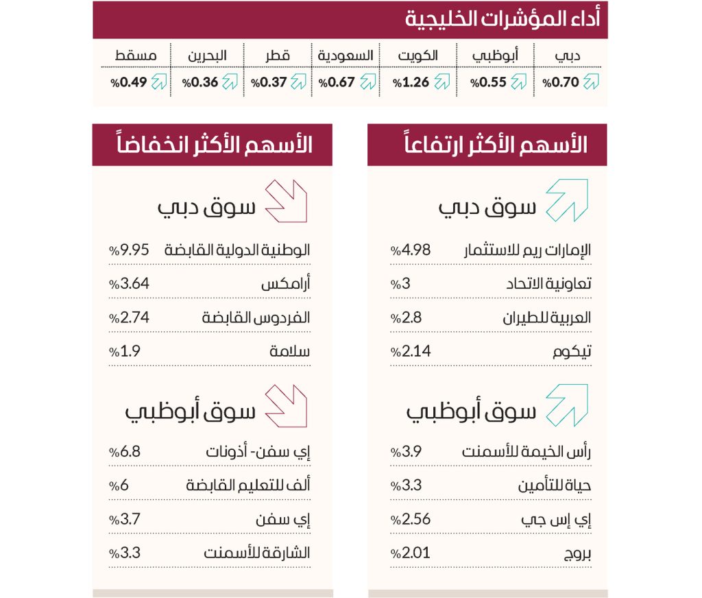 ارتفعت الأسهم في البورصات الخليجية بشكل جماعي، أمس، في منتصف جلسات الأسبوع، وصعد مؤشر السوق الرئيسية في البورصة السعودية 0.67 %، والكويت 1.26 %، وقطر 0.37%، وارتفع مؤشر البحرين العام 0.36 %، وفي سلطنة عُمان زاد مؤشر بورصة مسقط 0.49 %.