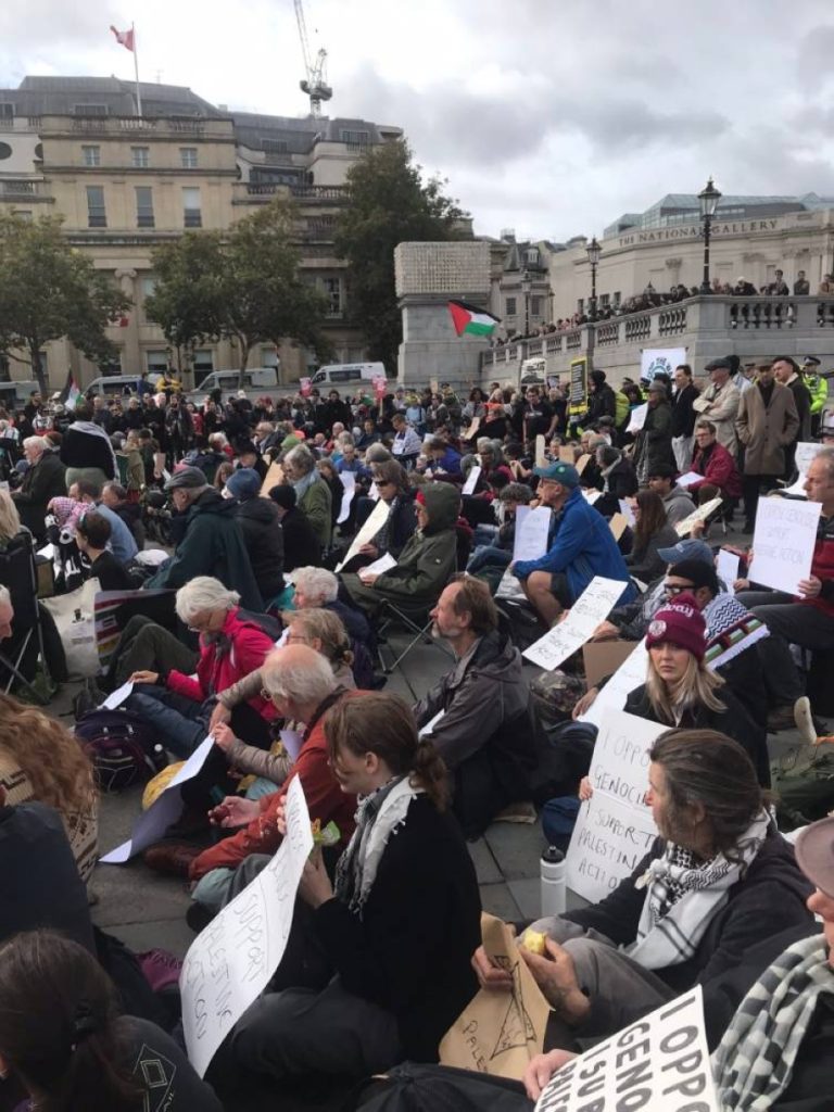 وأكدت الشرطة أن الاحتجاجات، التي نظمتها مجموعة «ديفيند أور جوريز» تجمع نحو 1000 شخص في ترافالغار، حيث كتب المتظاهرون شعارات على لافتات شخصية قبل الجلوس سلمياً، لكنها تحولت إلى اعتقالات جماعية بعد رفض الشرطة السماح بعرض الدعم للمجموعة، مع حمل بعض المتظاهرين، بمن في ذلك كبار السن، بعيداً عن الميدان.