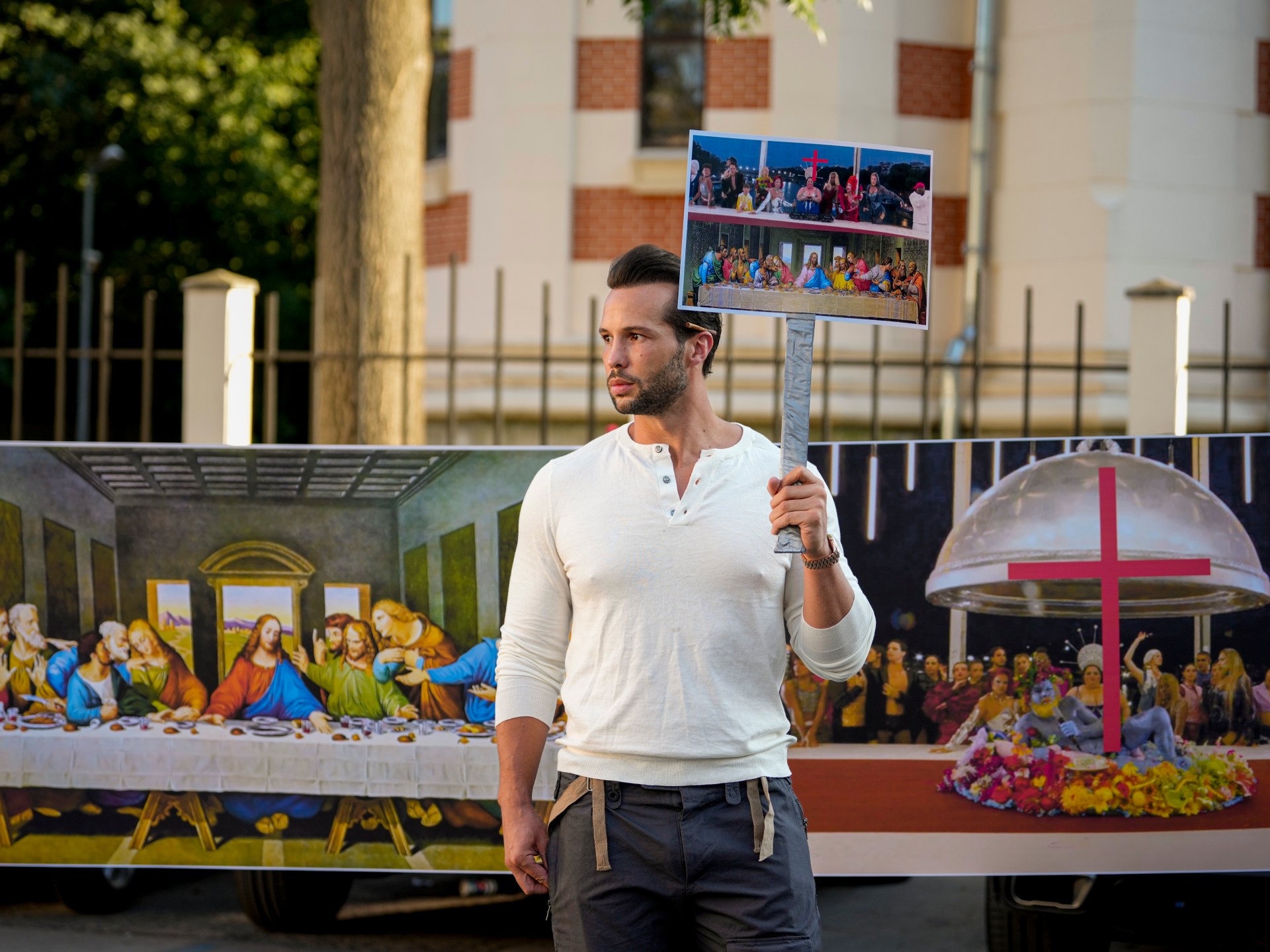 وفي الافتتاح، جرى تقديم لوحة فنية حيّة تشبه لوحة “العشاء الأخير” للفنان الإيطالي ليونارد دافينشي، وتكونت من طاولة كبيرة اجتمع حولها رجال يرتدون أزياء نسائية ويتبرجون بشكل مبالغ به، بالإضافة إلى عارضة أزياء متحولة جنسيا.