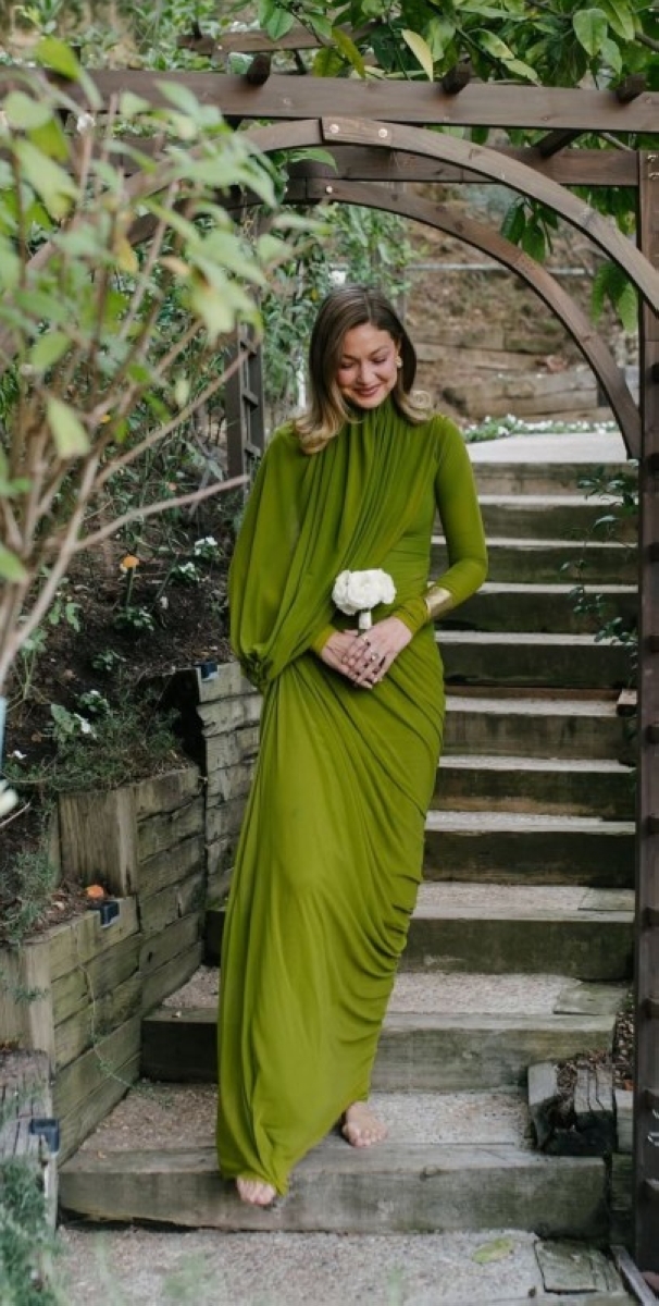 اختارت جيجي فستاناً طويلاً بلون زيتي هادئ يتميز برقبة عالية وقماش انسيابي يعكس روح المناسبة الطبيعية، ونسّقته مع إكسسوارات ذهبية بسيطة أضفت لمسة من الرقي الهادئ. أما بيلا فظهرت بفستان مشابه في اللون مع تصميم أكثر جرأة يتضمن فتحة صدر أنيقة وشق جانبي أظهر رشاقتها بأسلوب راقٍ ومتوازن. المفاجأة التي أثارت إعجاب الحضور كانت ظهورهما حافيتَي القدمين خلال المراسم، في لفتة رمزية تعبّر عن الراحة والبساطة والانسجام مع الأجواء العائلية.