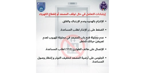 ووجهت «الإطفاء» نصائح لمن يتعرضون لهذا الحادث بعدم محاولة فتح المصاعد والتزام الهدوء والجلوس في أرضية المصعد إلى جانب إبلاغ عمليات وزارة الداخلية والضغط على زر طلب مساعدة.