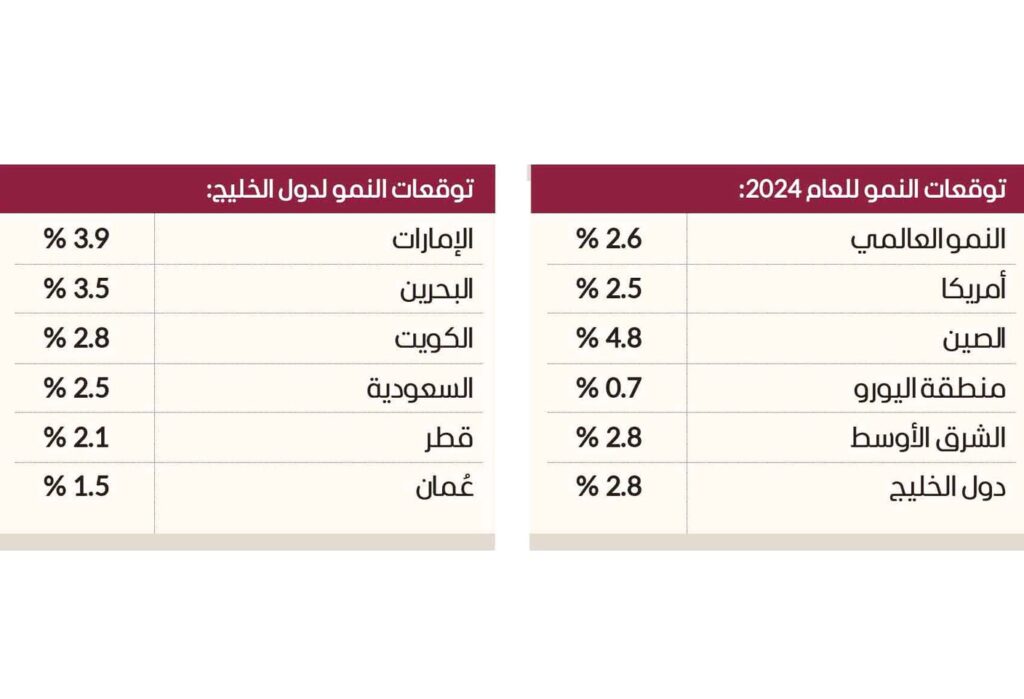 وقدر تقرير البنك الدولي نمو اقتصادات دول مجلس التعاون الخليجي بنسبة 2.8% في العام 2024 ترتفع إلى 4.7% في 2025، بينما من المتوقع أن تنمو اقتصادات الدول المصدرة للنفط بنسبة 2.8% و4.2% في 2024 و2025 على التوالي.