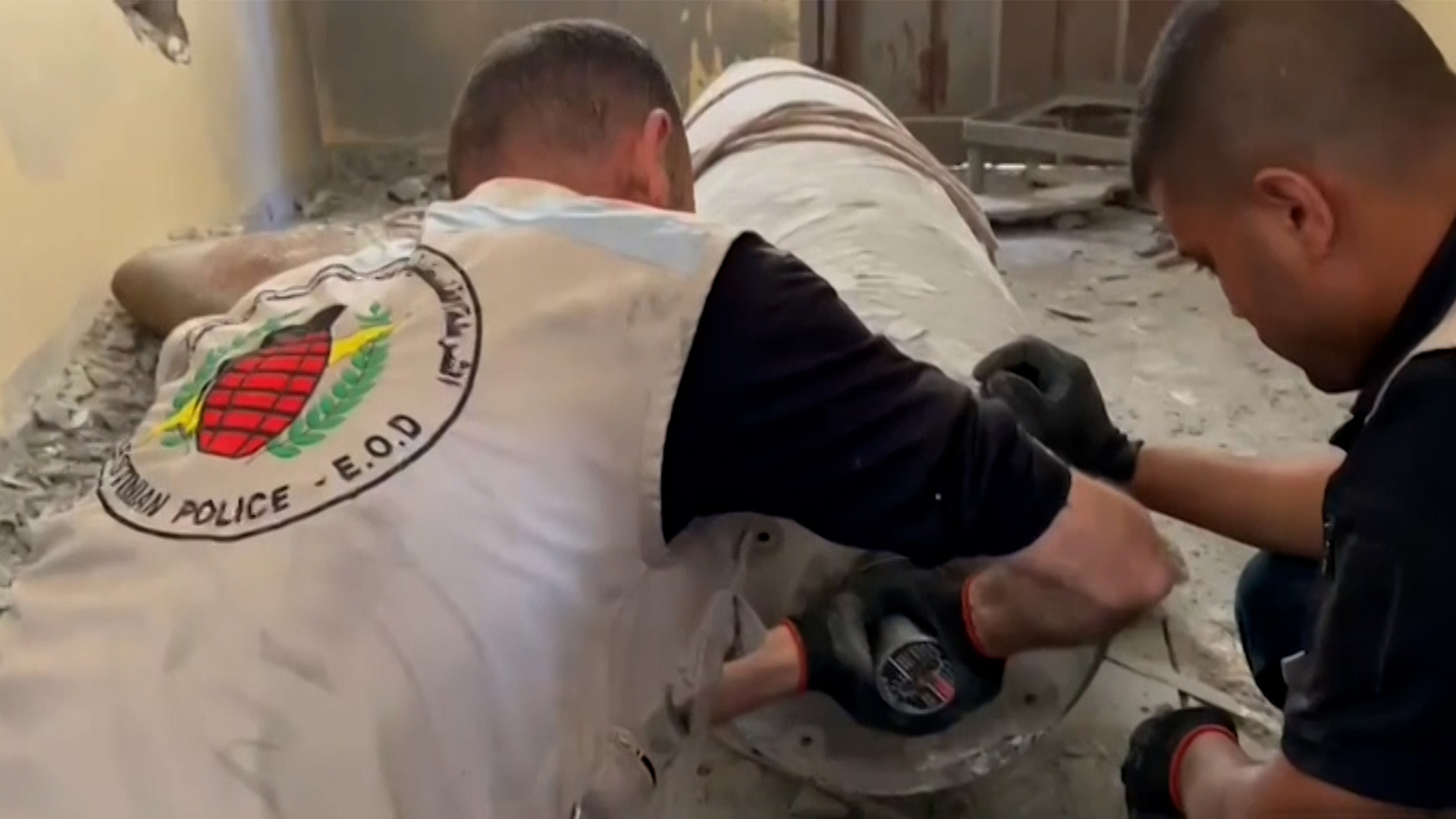 وظهر في الفيديو -الذي عرضته قناة الجزيرة- طواقم وحدة المتفجرات وهم يقومون بتفكيك صاروخ من نوع “إف 16” أطلقه جيش الاحتلال الإسرائيلي على أحد المنازل.