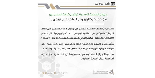 أعلن ديوان الخدمة المدنية ترشيح جميع المسجلين من التربويين في تخصص علم النفس للعمل في وزارة التربية. وأن إجمالي الترشيحات بلغ 12904 مواطنين. وأوضح الديوان في بيان رسمي أنه تم توظيف المسجلين بنظام التوظيف المركزي من حملة هذا المؤهل بناء على توجيهات وزير التربية ووزير التعليم العالي والبحث العلمي د.عادل العدواني، بإضافة منتظري التوظيف في هذا التخصص ضمن احتياجات وزارة التربية.