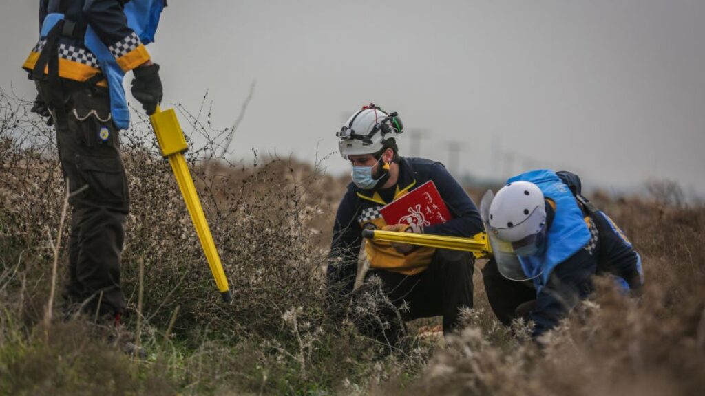 Members of the Syrian civil defence known as the White Helmets, equipped with protective outfits, get ready to search and neutralise unexploded weapons in a field, on the outskirts of al-Jinah village in Syria's northern Aleppo province, on June 23, 2022. The shelling and airstrikes responsible for a large part of the Syrian war's half million deaths have decreased in recent years. But explosive remnants laid by all sides in the 11-year-old conflict are causing more deaths in Syria than anywhere else in the world, according to the United Nations. (Photo by Aaref WATAD / AFP)