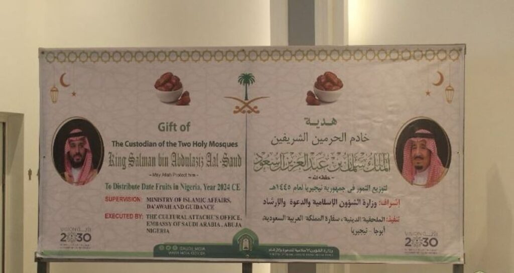 دشنت ​وزارة الشؤون الإسلامية والدعوة والإرشاد، ممثلة بالملحقية الدينية بسفارة المملكة في نيجيريا، أمس، برنامجي هدية خادم الحرمين الشريفين لتفطير الصائمين وتوزيع التمور خلال شهر رمضان المبارك 1445هـ.