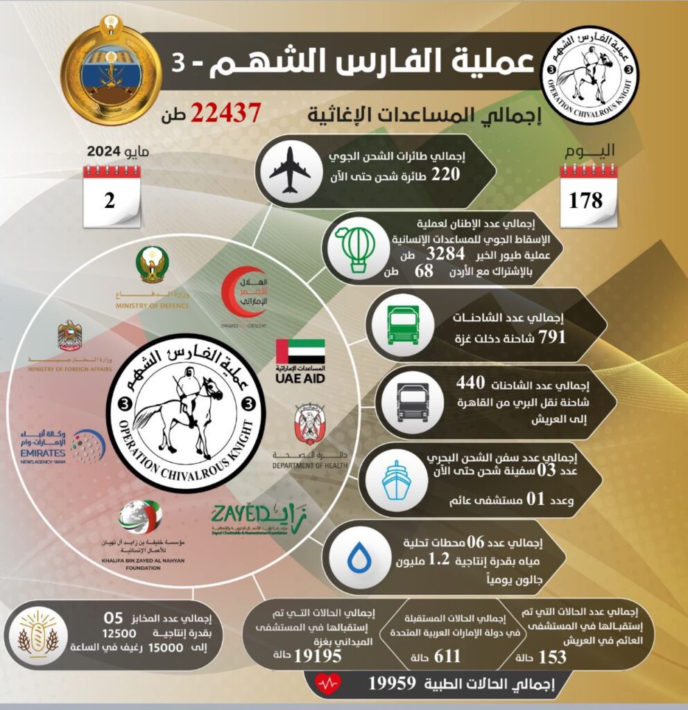تنفيذاً لتوجيهات صاحب السموّ الشيخ محمد بن زايد آل نهيان، رئيس الدولة، حفظه الله، وضمن عملية «الفارس الشهم 3»؛ تواصل دولة الإمارات نقل المساعدات الإنسانية لإغاثة المدنيين في قطاع غزة، لليوم الـ 178، حيث وصل عدد طائرات الشحن إلى 220 طائرة مساعدات، و440 شاحنة نقل بري، إضافة إلى 3 سفن شحن تحمل المساعدات، وسفينة رابعة عبارة عن مستشفى عائم، و6 محطات تحلية مياه بقدرة إنتاجية 1.2 مليون جالون يومياً، و5 مخابز بقدرة إنتاجية 12500 – 15000 رغيف في الساعة.