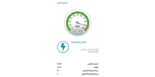 حافظ مؤشر الأحمال الكهربائية على استقراره يوم أمس في المنطقة الخضراء، حيث بلغت الأحمال 16230 ميغاواط عند درجة حرارة 47 مئوية.
