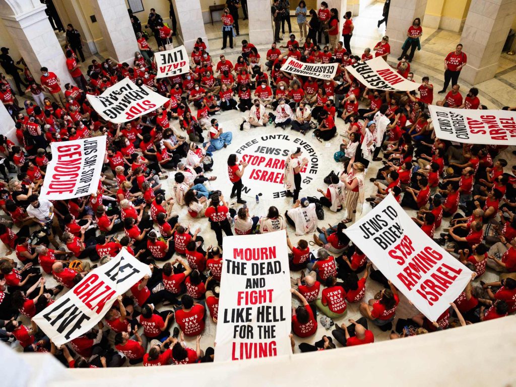وخلال التجمع الذي نظمه ائتلاف “الصوت اليهودي من أجل السلام”، شكّل المشاركون حلقات دائرية داخل المبنى وهم يلبسون قمصانا حمراء في إشارة إلى حجم المجازر في قطاع غزة.