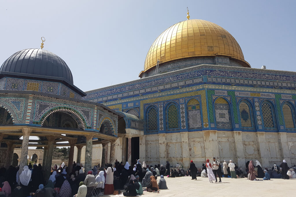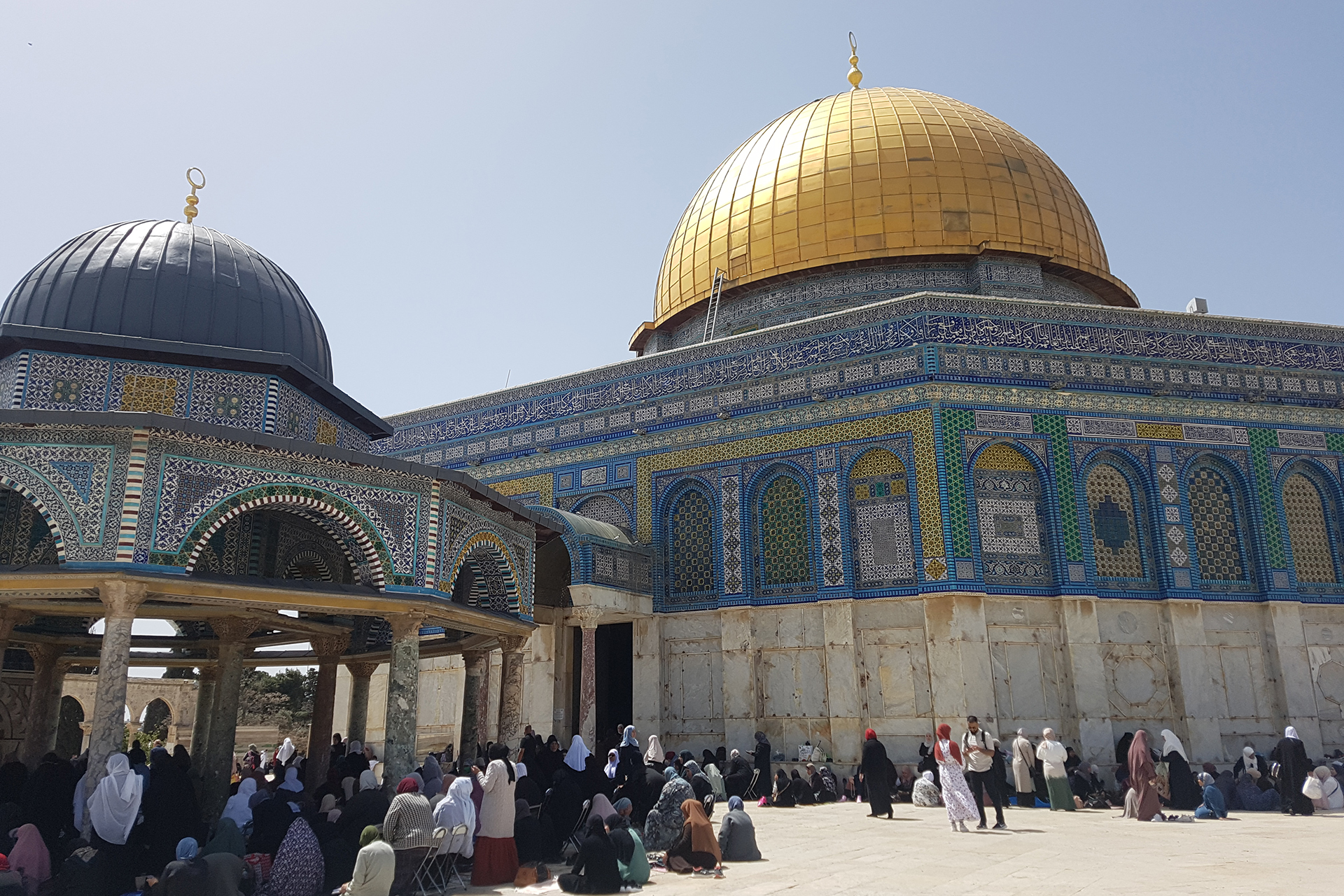 يُرفع الأذان في رحاب أولى القبلتين فتقف النساء لتسوية الصفوف وترفع الأكُفّ إلى السماء تضرعا إلى الله بتفريج الكرب وتغيير أحوال فلسطين وأهلها إلى الأفضل.