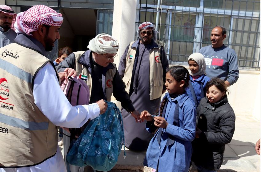 استمرارا للنهج الإنساني الذي تتتبعه هيئة الهلال الأحمر الإماراتي ،وفي أول أيام شهر رمضان الفضيل ، سـلّم نائب قائد فريق الإغاثة الإماراتي سعادة / يوسف عبدالله الهرمودي ، ومتطوعي فريق الإغاثة الإماراتي، حقائب مدرسية تحتوي على قرطاسية للطلبة الأيتام في مدرستي اليرموك والعين البيضاء في الأزرق الشمالي التابع لمحافظة الزرقاء الأردنية.