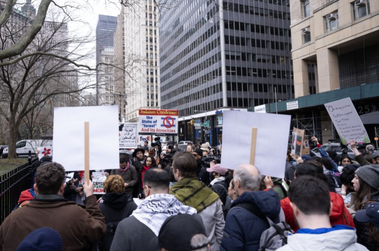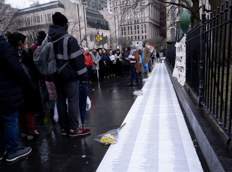 وخلال المظاهرة الاحتجاجية التي ستستمر 24 ساعة، حاول المتحدثون إيصال أصواتهم إلى إريك آدامز عمدة نيويورك وأعضاء مجلس البلدية، ودعوا الولايات المتحدة إلى التوقف عن دعم إسرائيل.