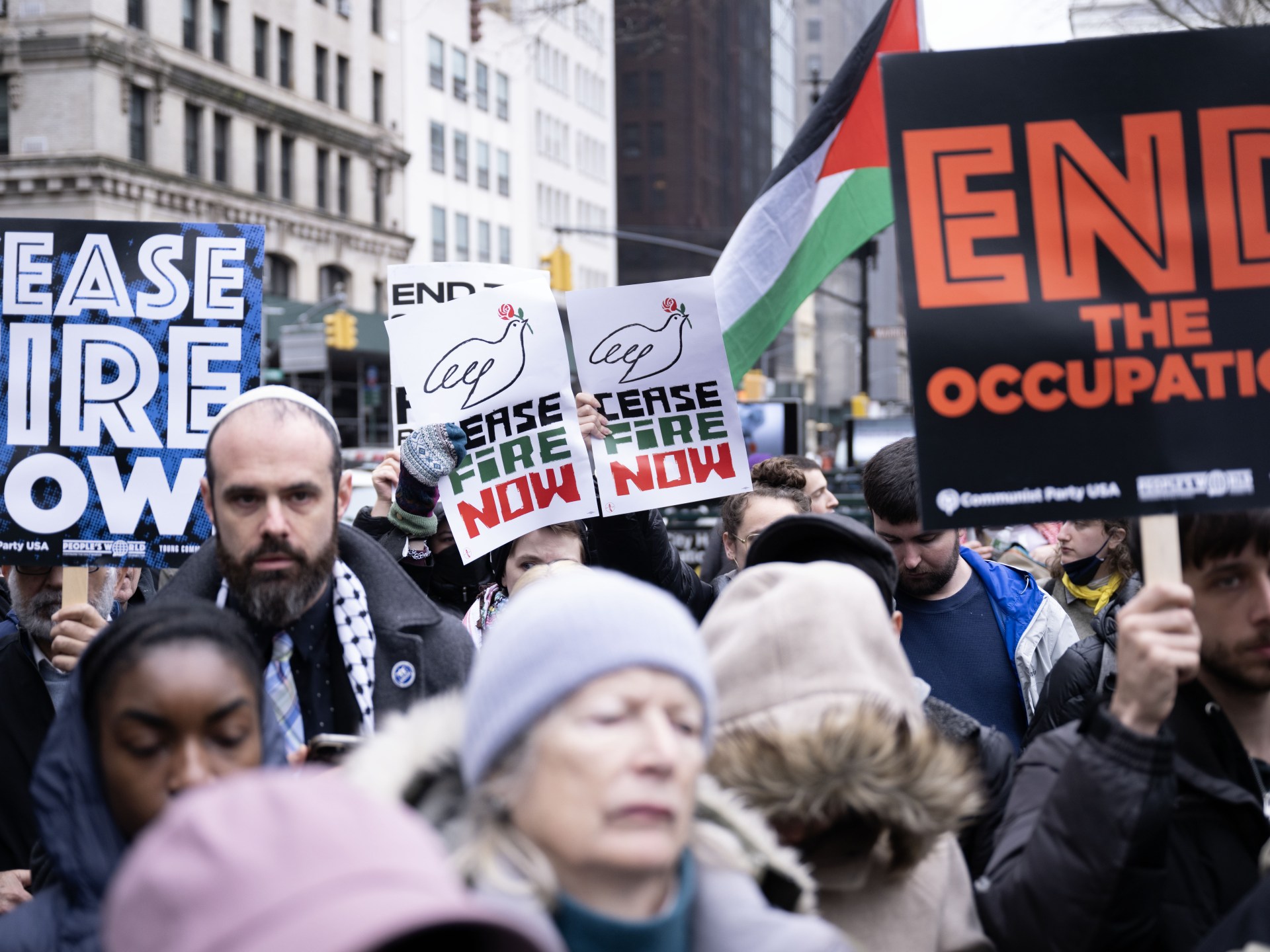 انطلقت في نيويورك الأميركية اليوم الخميس مظاهرة مؤيدة لفلسطين ستتواصل 24 ساعة للمطالبة بإنهاء المجازر التي ترتكبها إسرائيل ضد المدنيين في قطاع غزة، ووقف فوري لإطلاق النار.