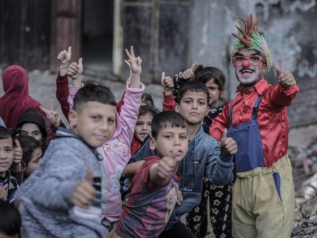 • بالصور.. مهرّج مكلوم يرسم الابتسامة على وجوه أطفال غزة