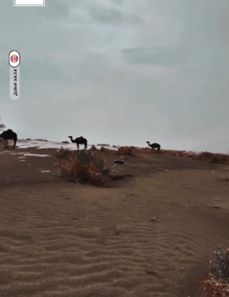 وبدت الإبل تغتسل بالمطل الهاطل وتقف في سكينة تامة وسط تلك الأجواء الجذابة، وفق المقطع الذي نشرته “العربية”.