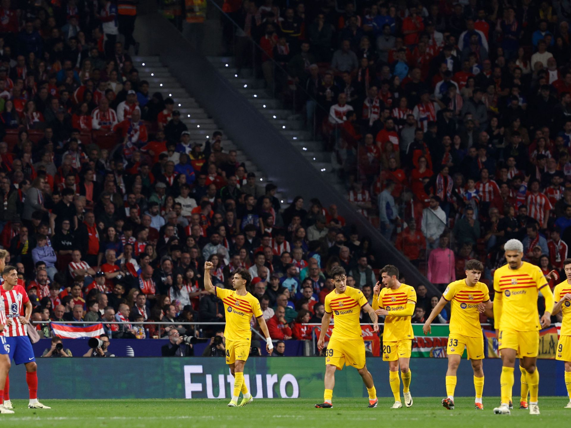 وعلى ملعب (سيفيتاس ميتروبوليتانو) معقل أتلتيكو في العاصمة الإسبانية مدريد، تقدم برشلونة بهدف سجله البرتغالي جواو فيليكس في الدقيقة 39 على عكس سير المباراة التي كان أتلتيكو فيها الأفضل.
