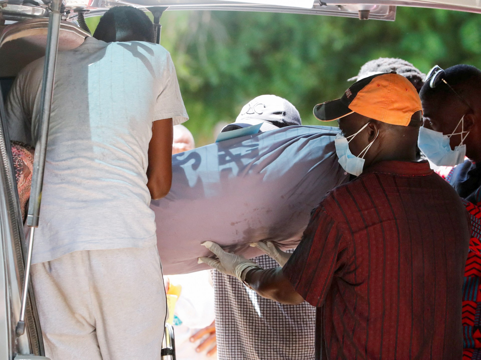 FILE PHOTO: Workers receive the exhumed bodies of followers of a Christian cult named "Good News International Church", who believed they would go to heaven, if they starved themselves to death in Shakahola, at the Malindi sub district hospital mortuary in Malindi, Kilifi county, Kenya April 27, 2023. REUTERS/Monicah Mwangi/File Photo