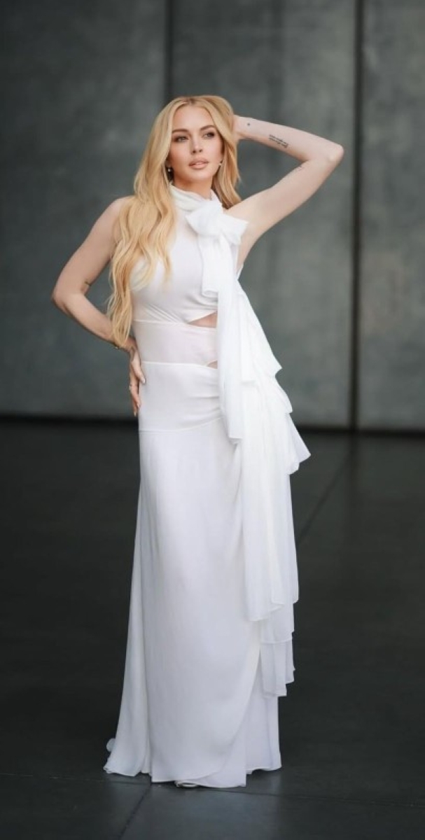 بعد غياب.. ليندسي لوهان تُشرق بفستان أبيض أنيق