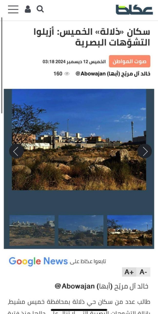 أوضح المتحدث باسم بلدية محافظة خميس مشيط بدر القرني، أنه إشارة إلى ما تم نشره اليوم في صحيفة «عكاظ» بعنوان (سكان «ذلالة» الخميس: أزيلوا التشوّهات البصرية)، فإن الأرض التي بها تشوهات بصرية مزعجة، ولا زال سكان حي ذلالة يشتكون من بقاء التشوهات دون إزالة منذ فترة سابقة وحتى اللحظة، هي تابعة لوزارة التعليم وسبق مخاطبتها، وإبلاغها بذلك، وجار العمل على المتابعة.