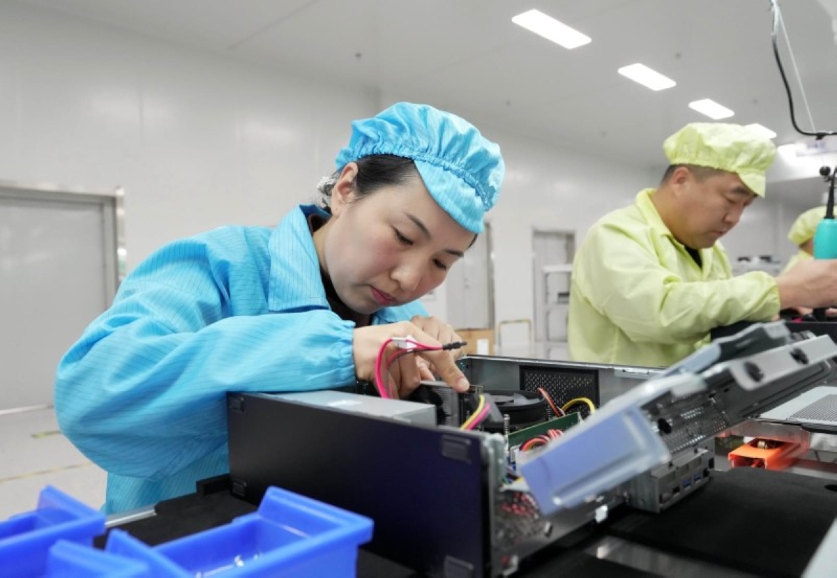 شهد قطاع تصنيع المعلومات الإلكترونية في الصين نمواً مطرداً في الأرباع الثلاثة الأولى من العام الحالي 2025، وفقًا لوزارة الصناعة وتكنولوجيا المعلومات الصينية. وفي الصورة عاملان أثناء تصنيع جهاز كمبيوتر بأحد المصانع بالعاصمة بكين. (إيكونومومي دايلي الصينية).