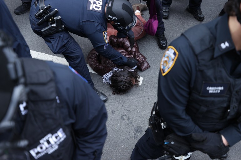 وقد أعلنت الشرطة اعتقال عدد من المشاركين في الاعتصام الطلابي بجامعة نيويورك للمطالبة بوقف الحرب على قطاع غزة، مؤكدة إيقاف 57 طالبا، اعتُقل منهم 44، بينما أخرجت الشرطة بالقوة 13 طالبا أصروا على البقاء بالاعتصام، وفككت خيامهم.
