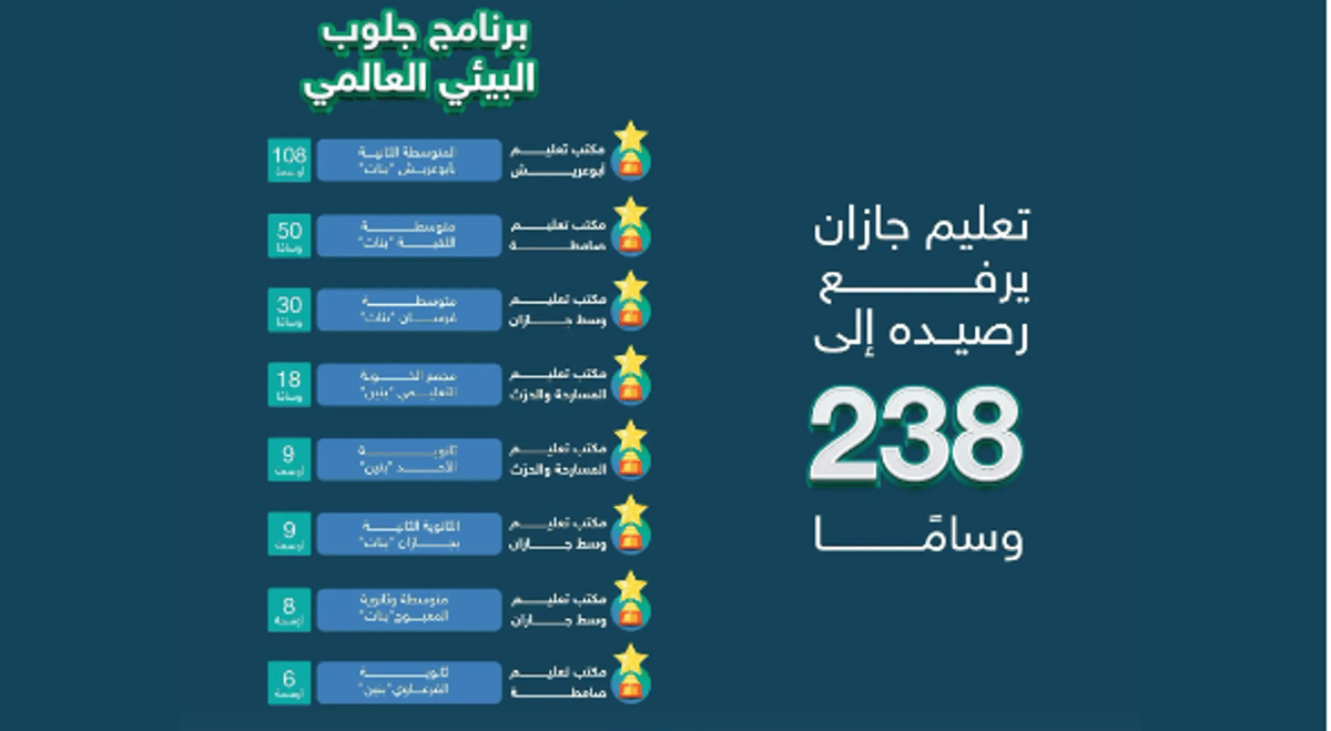 رفعت الإدارة العامة للتعليم بمنطقة جازان، رصيدها في برنامج «جلوب» البيئي إلى 238 وسامًا في عددٍ من المجالات البيئية والعلمية ؛ شملت بروتوكول الغلاف الجوي والمناخ والغيوم والأرض كنظام والغطاء الأرضي والهيدرولوجيا ورطوبة التربة ودرجة حرارتها ورصد أنواع السحب وعلم الفينولوجيا وعموم العالم وتوصيف التربة إلى جانب البحوث العلمية المنشورة في المعرض الافتراضي الخاص ببرنامج جلوب البيئي.