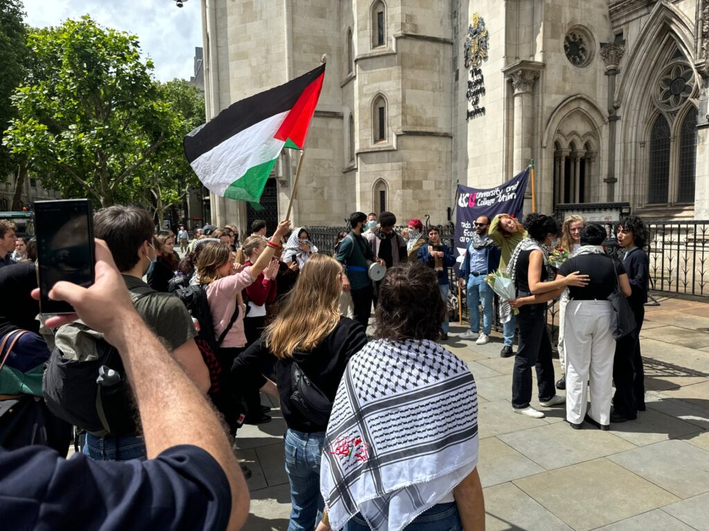 من أمام محكمة العدالة الملكية وسط لندن تظاهره في دعم قضية اخلاء جامعة لندن للدراسات الاقتصادية المصدر الجزيرة