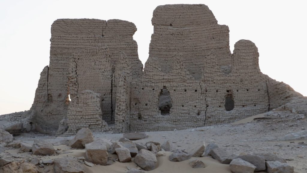 في نهاية طريق صحراوي ممهد، تلمع على جانبيه رمال داعبتها أشعة الشمس، تجذب الأنظار لافتة وضعتها السلطات المحلية في محافظة الفيوم وسط مصر.