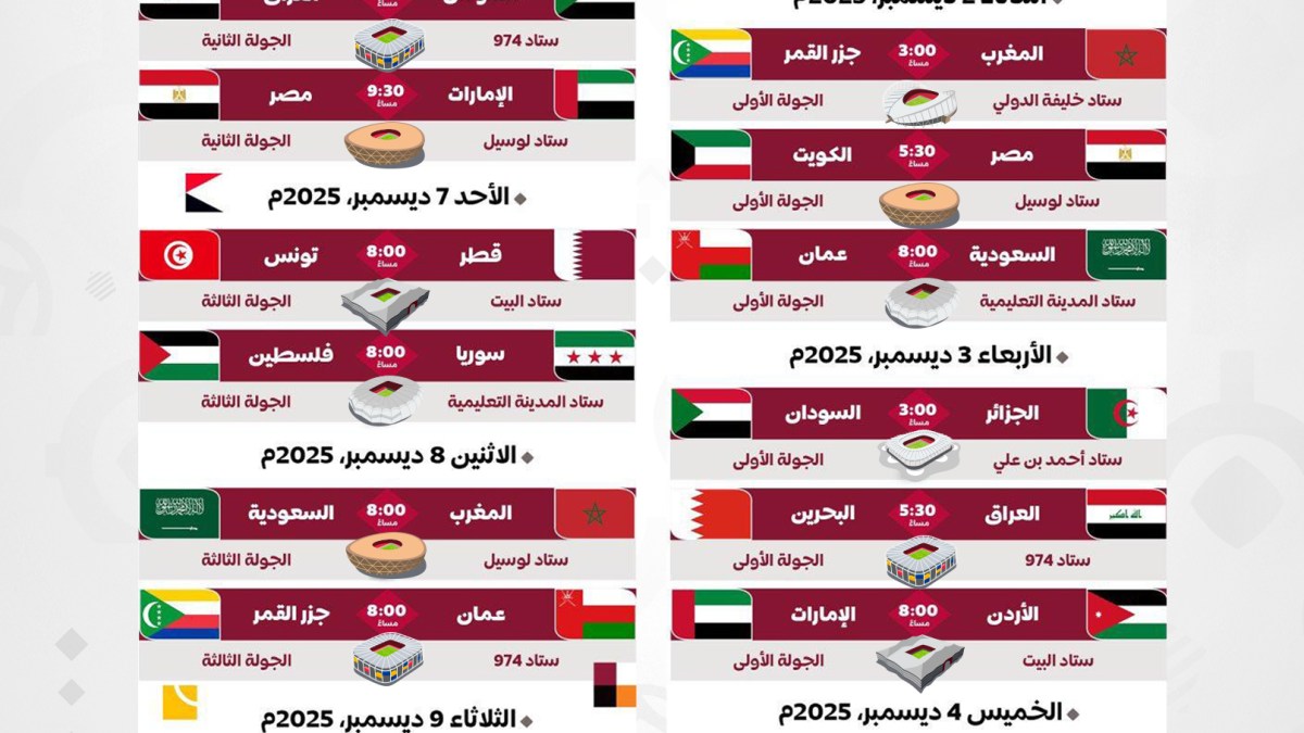 تُستعرض في هذا المقال جدول نتائج مباريات بطولة كأس العرب 2025 لكرة القدم المقامة في العاصمة القطرية الدوحة، والتي انطلقت فعالياتها يوم الاثنين الموافق الأول من ديسمبر/كانون الأول. تشهد البطولة مشاركة 16 منتخباً عربياً يتنافسون على اللقب المرموق، في منافسات حماسية من المقرر أن تستمر حتى الثامن عشر من ديسمبر. وشهدت الجولة الأولى مفاجآت مدوية بفوز منتخبي سوريا وفلسطين على تونس وقطر على التوالي.