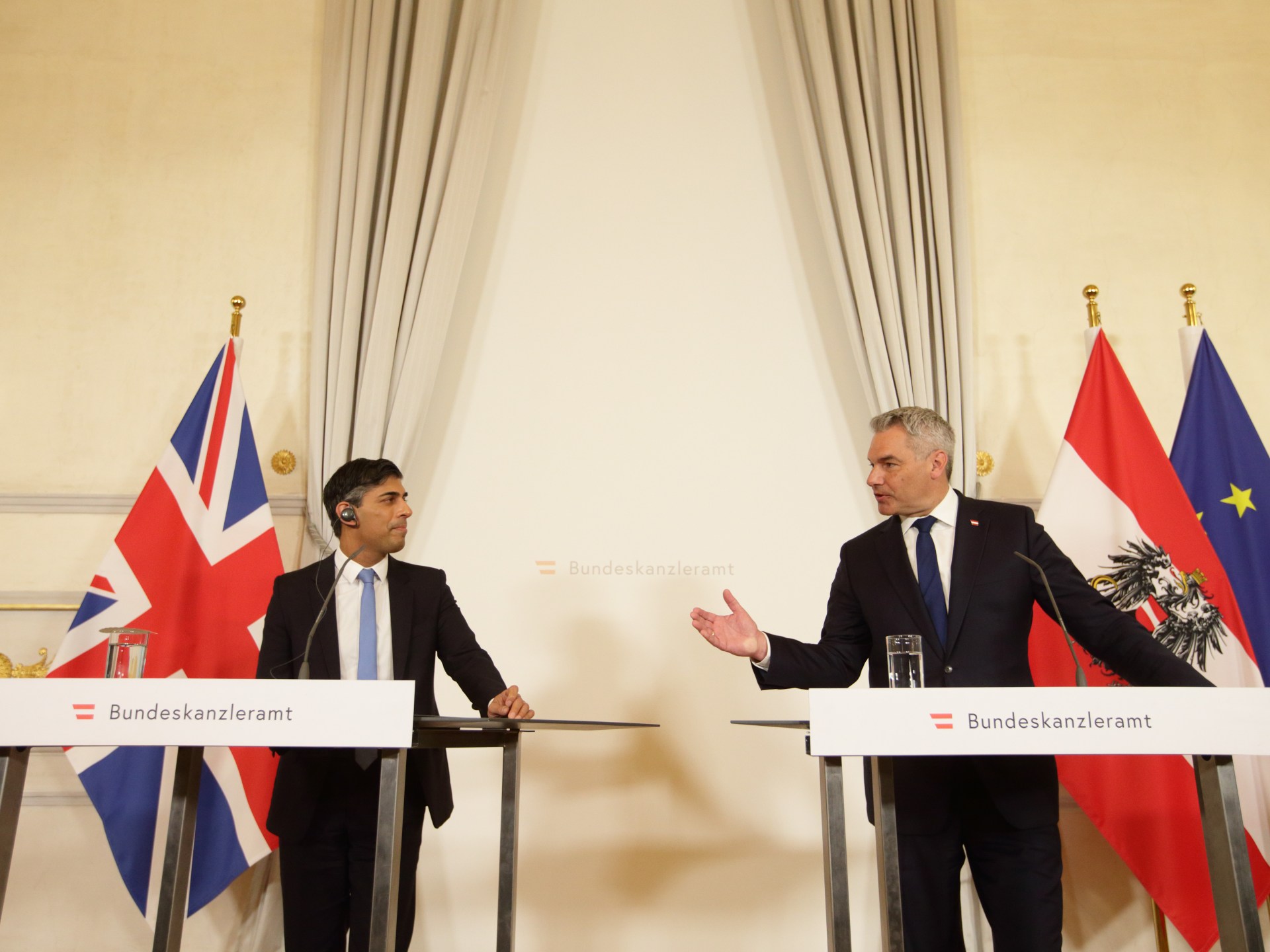 وعقب اجتماع مع رئيس الوزراء البريطاني ريشي سوناك في فيينا في مايو/أيار الماضي، قال المستشار النمساوي كارل نيهامر إن النمسا سوف تبذل جهودا في الاتحاد الأوروبي لإقرار سياسة هجرة جديدة، يتم بموجبها تنفيذ إجراءات اللجوء في الدول الأفريقية إذا لزم الأمر، في إشارة إلى خطة بريطانيا التي تقضي بإرسال المهاجرين غير النظاميين إلى رواندا، وتقديم طلبات لجوئهم من هناك.