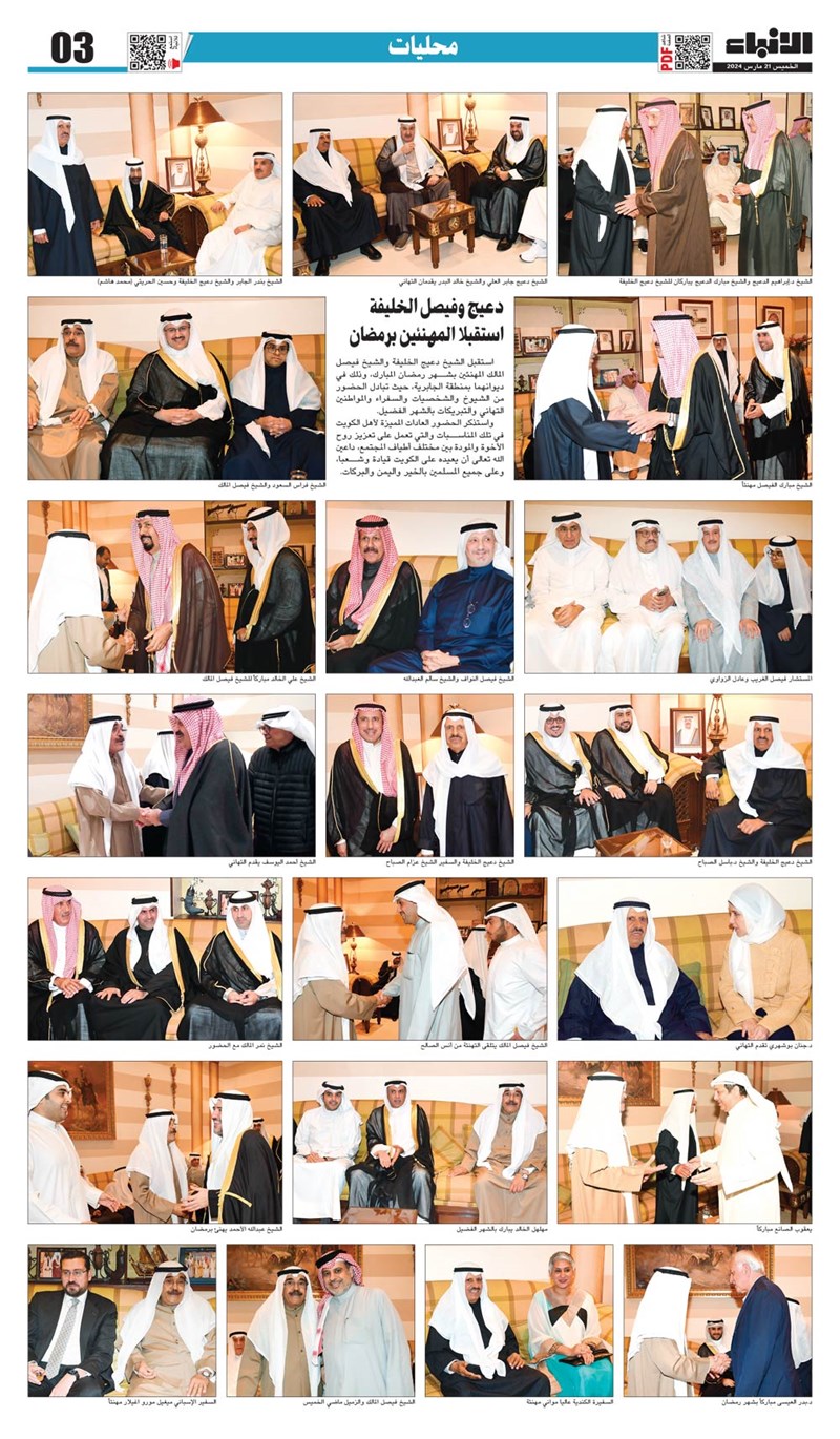استقبل الشيخ دعيج الخليفة والشيخ فيصل المالك المهنئين بشهر رمضان المبارك، وذلك في ديوانهما بمنطقة الجابرية، حيث تبادل الحضور من الشيوخ والشخصيات والسفراء والمواطنين التهاني والتبريكات بالشهر الفضيل.