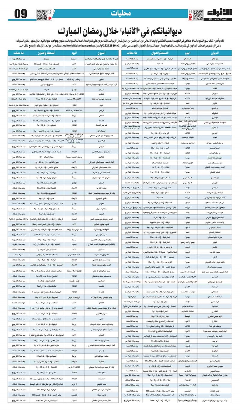 تقديراً من «الأنباء» لدور الديوانيات الاجتماعي في الكويت وتجسيدا لمكانتها وأثرها الإيجابي بين المواطنين من خلال تبادل الزيارات، فإننا نحرص على نشر أسماء أصحاب الديوانيات وعناوين ومواعيد ديوانياتهم خلال شهر رمضان المبارك.