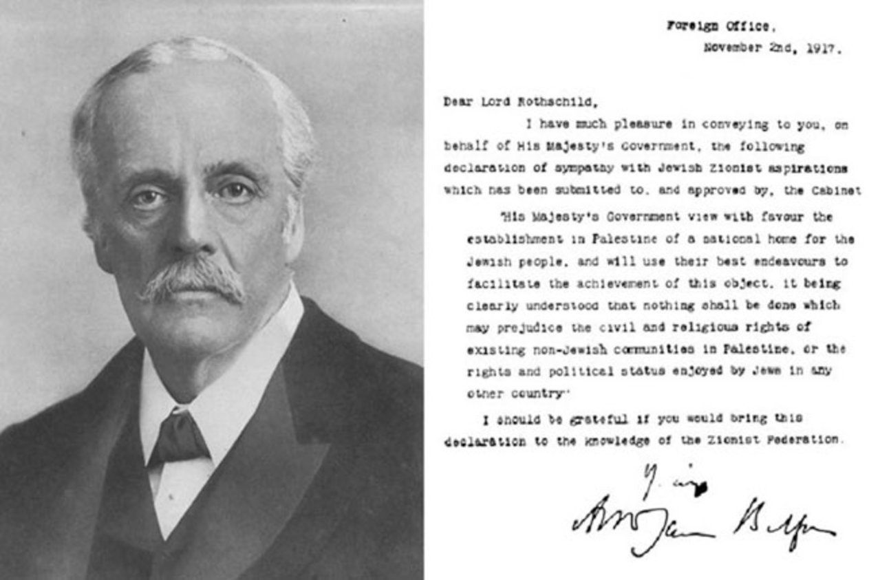 إن حكومة صاحب الجلالة تنظر بعين العطف إلى إقامة مقام قومي في فلسطين للشعب اليهودي، وستبذل غاية جهدها لتسهيل تحقيق هذه الغاية، على أن يفهم جلياً أنه لن يؤتى بعمل من شأنه أن ينتقص من الحقوق المدنية والدينية التي تتمتع بها الطوائف غير اليهودية المقيمة في فلسطين، ولا الحقوق أو الوضع السياسي الذي يتمتع به اليهود في أي بلد آخر.