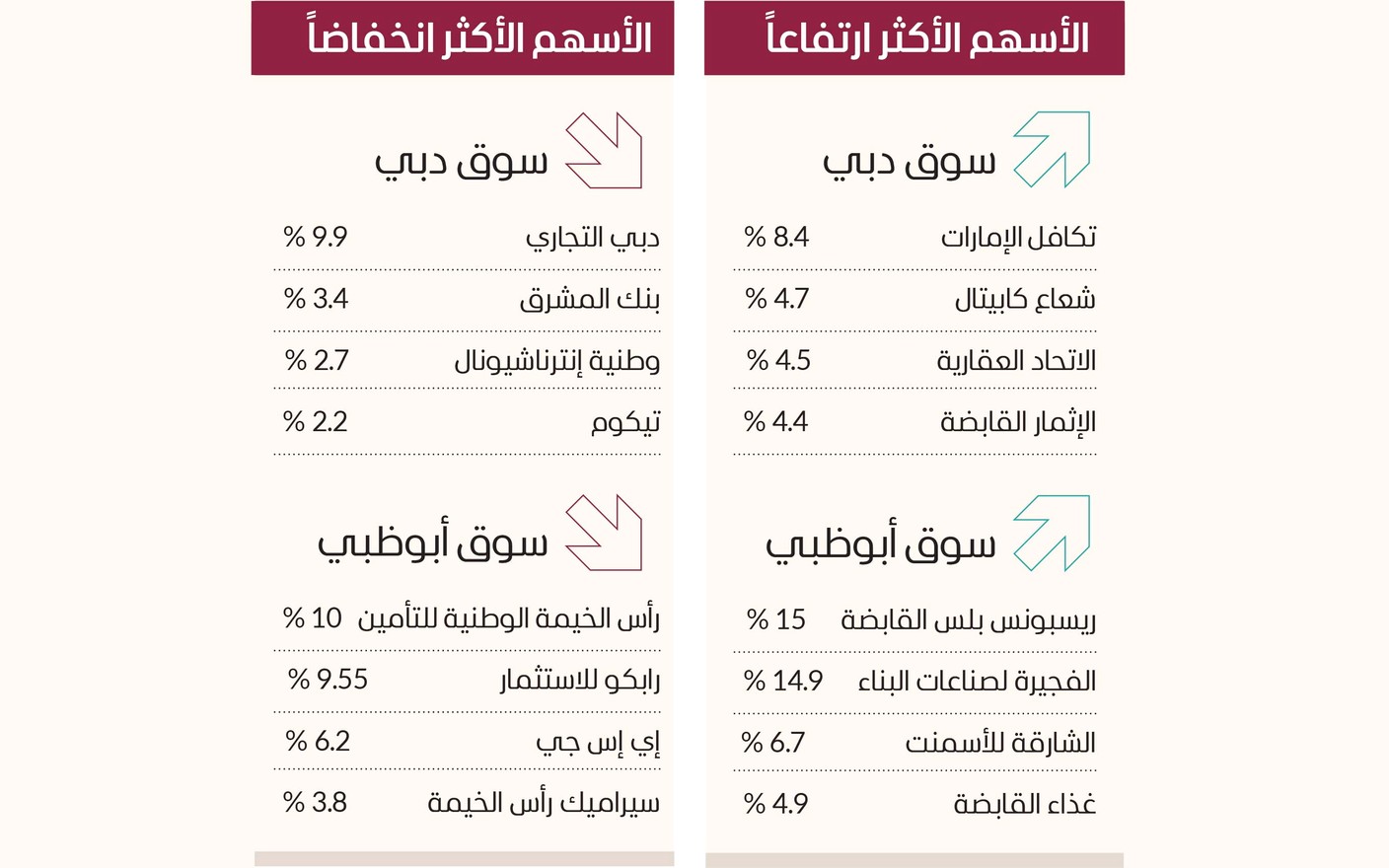 وارتفع «تكافل الإمارات» 8.4%، وشعاع كابيتال 4.7%، والاتحاد العقارية 4.5%، والإثمار القابضة 4.4%، وديار للتطوير 1.6%، وإعمار للتطوير 1.2%، والإمارات دبي الوطني 0.87%. واتجه المستثمرون الأجانب غير العرب نحو الشراء في سوق دبي بصافي استثمار 49 مليون درهم بجلسة أمس، بعد تحقيقهم مشتريات بقيمة 120.95 مليون درهم مقابل مبيعات بنحو 71.94 مليون درهم.