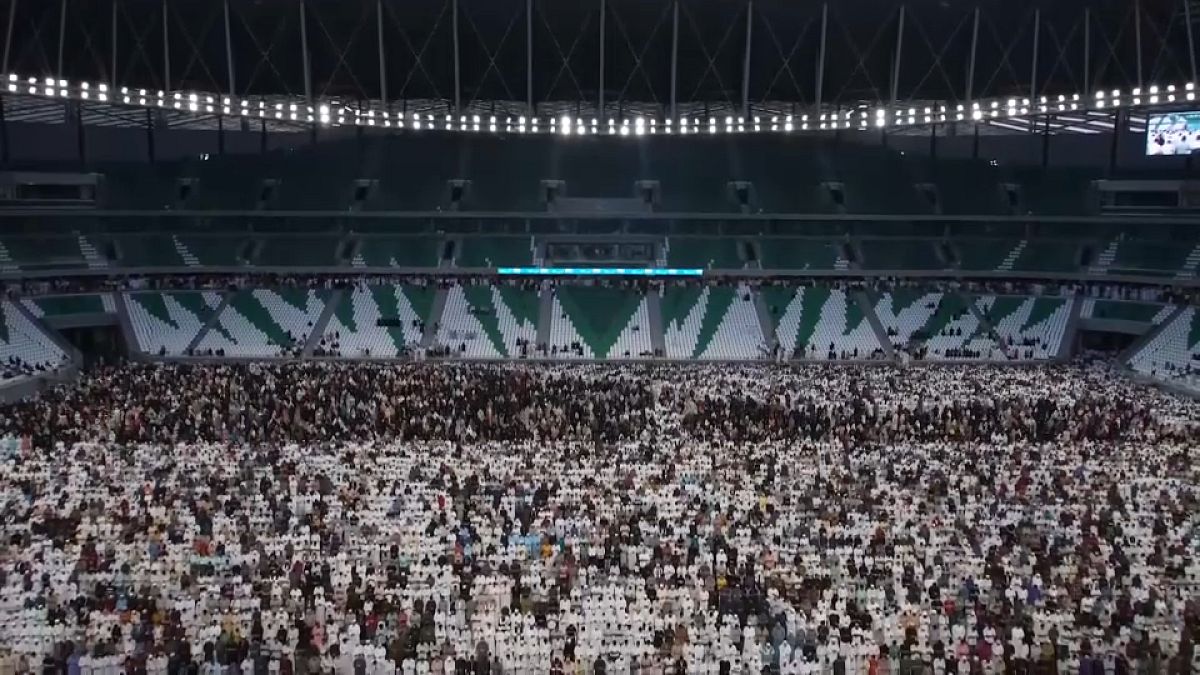 ووسط مشهد مهيب ومليء بالتأمل والخشوع، ملأت حشود المصلين المسلمين أرض الملعب في الدوحة، مع انتشار سجادات الصلاة على طول أرض الملعب الذي استضاف فرق كرة القدم العالمية خلال بطولة كأس العالم.