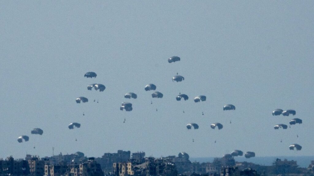 شاهد: استمرار عمليات إسقاط المساعدات الإغاثية على قطاع غزة وسط القصف