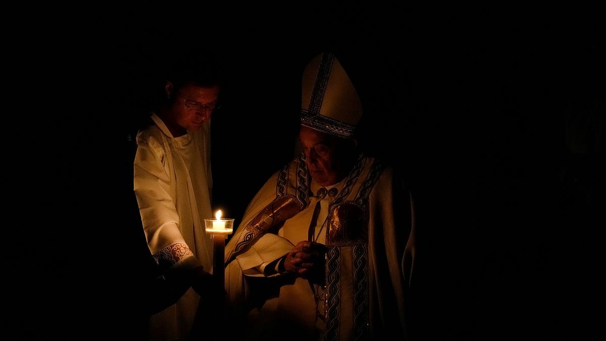 بحضور آلاف المؤمنين الآتين من أنحاء العالم، دخل الحبر الأعظم البالغ 87 عاماً، إلى الكاتدرائية المظلمة على كرسيه المتحرك، وألقى صلاة الافتتاح، ثم بارك شمعة عيد الفصح المزينة وقاسم شعلتها مع الشموع الأخرى حتى أنارت الكنيسة بأكملها.