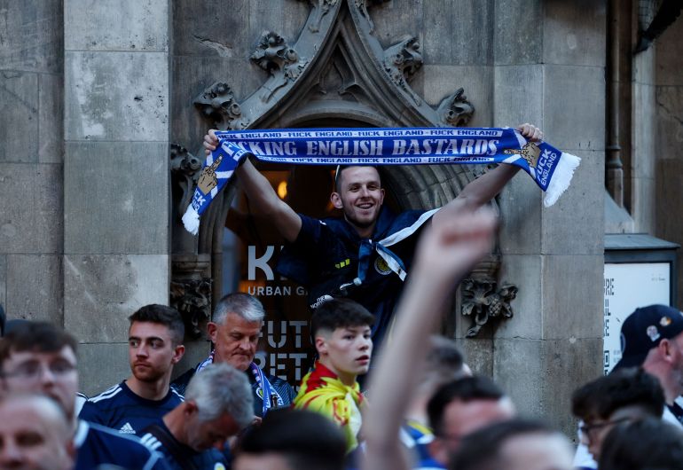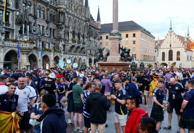 شهدت ساحة مارينبلاتز المركزية بمدينة ميونخ الألمانية تجمعا ضخما للجماهير الأسكتلندية، قبل لقاء منتخب بلادها مع نظيره الألماني، اليوم الجمعة، في المباراة الافتتاحية لبطولة كأس الأمم الأوروبية لكرة القدم (يورو 2024)، في ألمانيا.