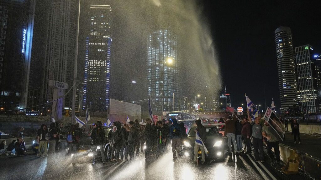 شاهد: الشرطة الإسرائيلية تستخدم خراطيم المياه لتفريق مظاهرة تطالب بتنحي نتنياهو