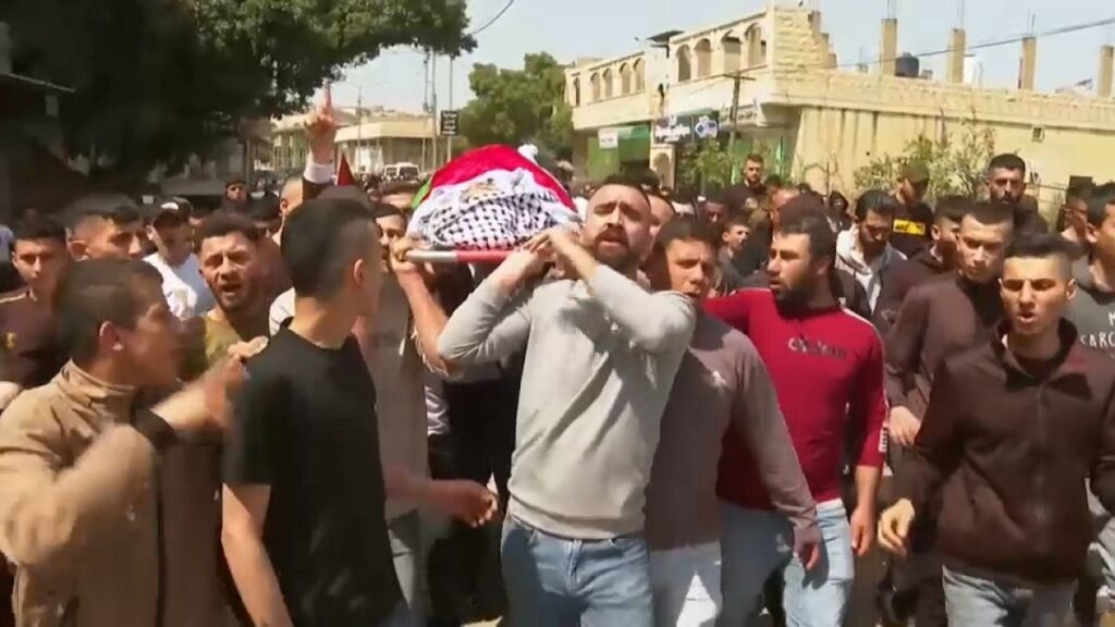 تجمع المشيعون في جنازة صبي فلسطيني يبلغ من العمر 13 عاماً في بلدة قباطية بالضفة الغربية، بعد مقتله فجر اليوم السبت برصاص القوات الإسرائيلية.