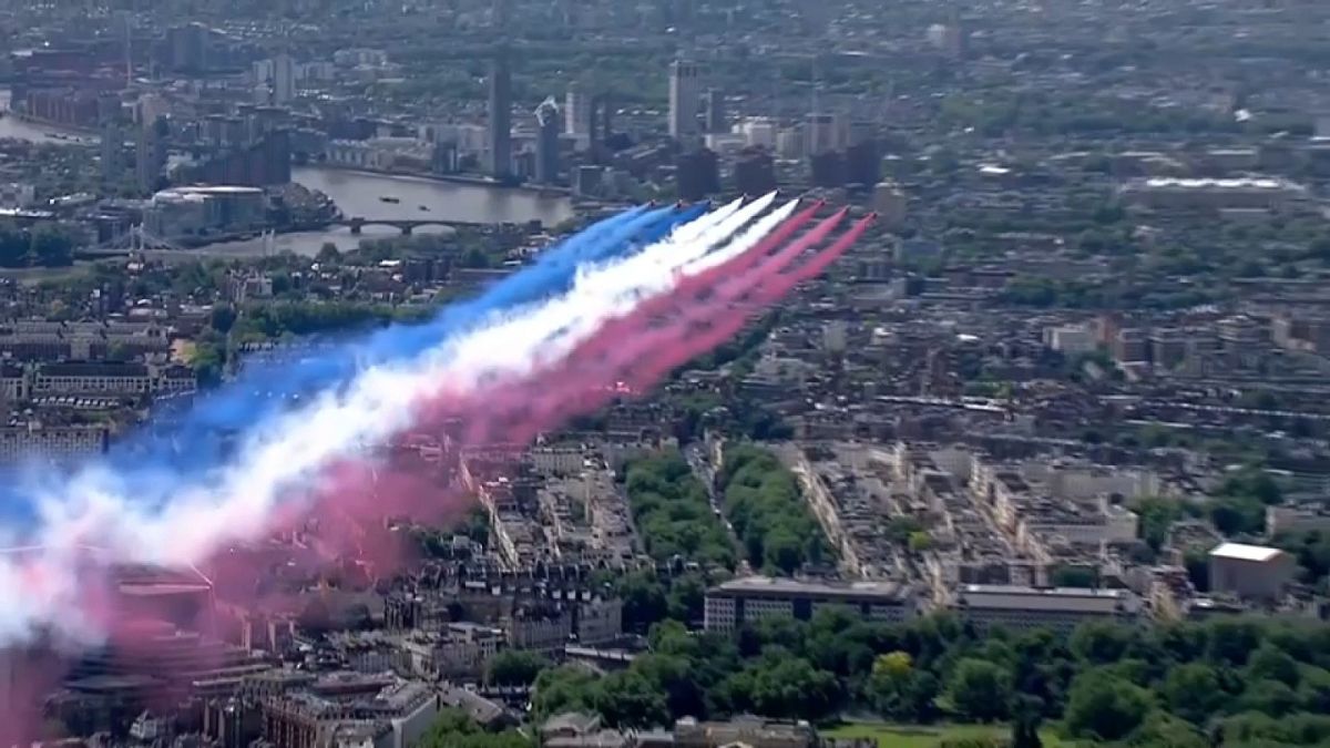 أطلق فريق “السهام الحمراء” أعمدة دخان ملونة بالأحمر والأبيض والأزرق فوق شرفة قصر باكنغهام، ممثلة ألوان العلم البريطاني.