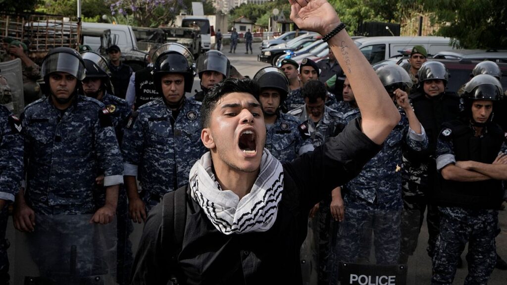 وهذه هي المرة الثانية في أقل من أسبوع التي يتظاهر فيها الطلاب في بيروت أمام السفارة المصرية، منتقدين مصر لعدم قيامها بما يكفي من أجل الفلسطينيين في غزة.