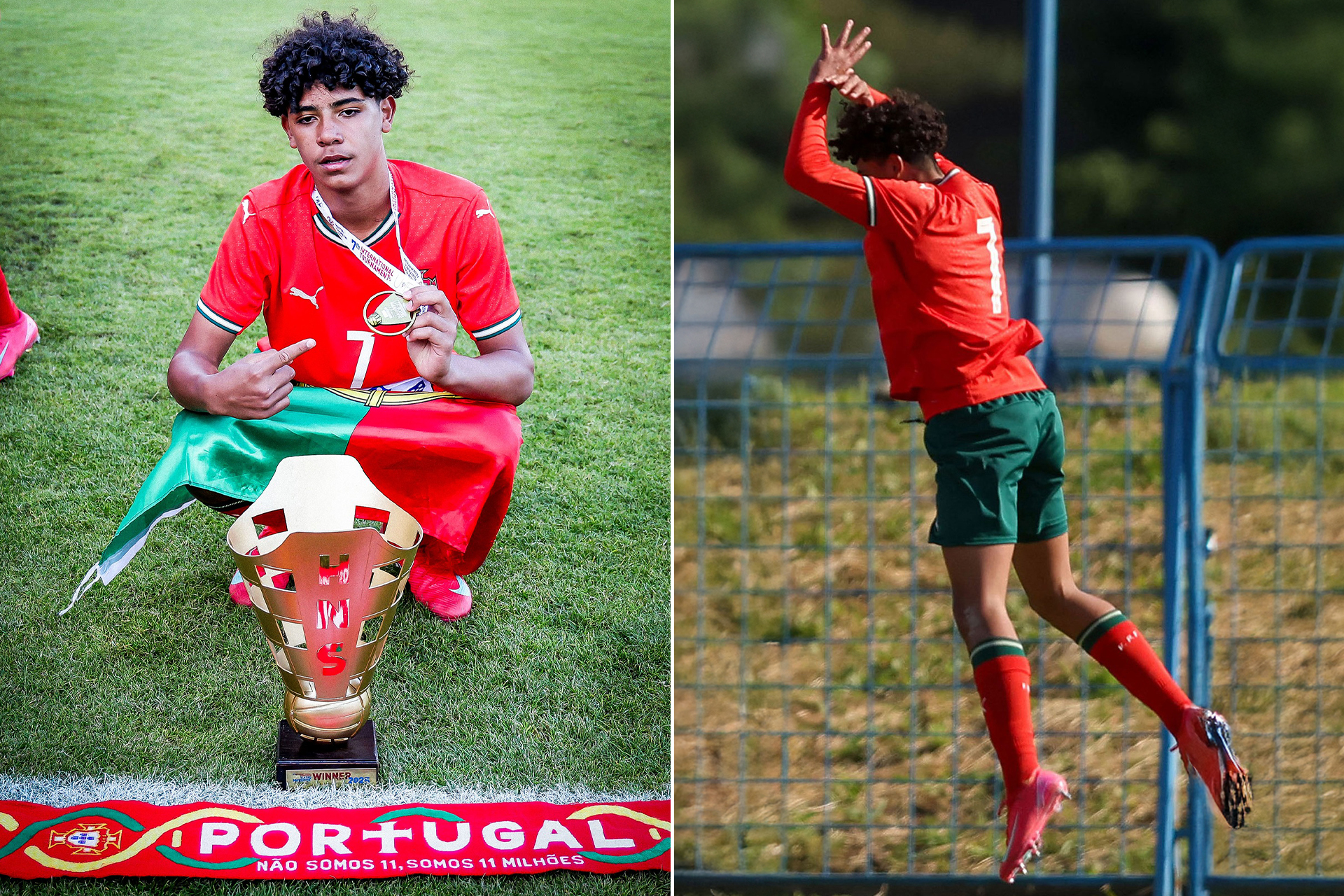 واحتفل كريستيانو جونيور بأول أهدافه الدولية مع زملائه عند الراية الركنية على طريقة والده كريستيانو رونالدو الشهيرة “سيييي Si”.